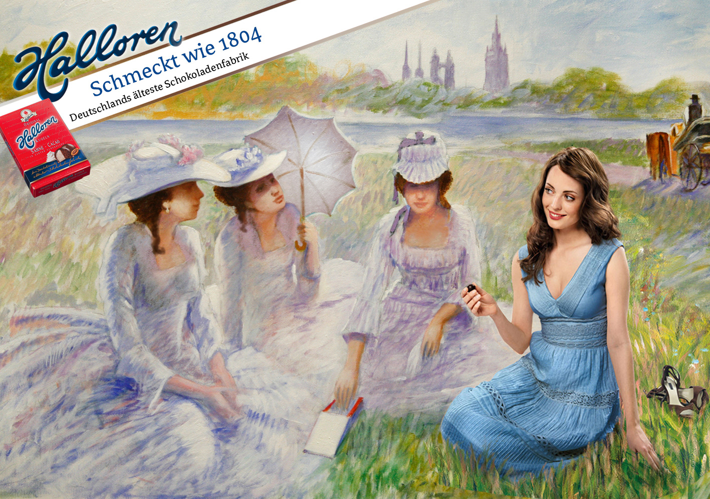 The big art forgers Posin Brothers did this impressionistic painting of a picnic on the meadows at the foot of historic Halle. One woman from the modern era was shot separate and pasted in. It was a pleasure to work with the unique, peculiar Posin brothers.